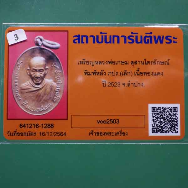 เหรียญหลวงพ่อเกษม เขมโก พิมพ์หลังภปร. (เล็ก) เนื้อทองแดง ปี 2523..3....64.12.20