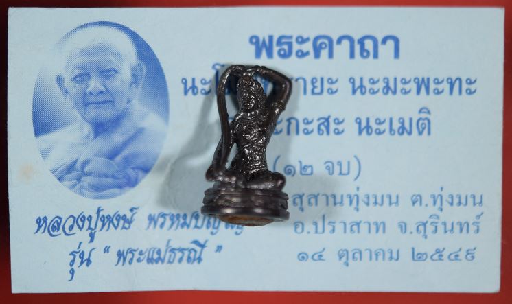ชื่อพระเครื่อง พระแม่ธรณีบีบมวยผม รุ่นแรก หลวงปู่หงษ์ พรหมปัญโญ เนื้อชนวน ก้นอุดผง ตอกโค๊ต สุสานทุ่งมน จ.สุรินทร์ พร้อมซองและใบกำกับ เคาะเดียวแดง
