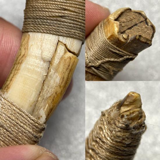 เครื่องรางอาถรรพ์แห่งพงไพร เขี้ยวหมู เครื่องรางของทนสิทธิ์เก่าโบราณ เก่า ธรรมชาติ เล่มนี้ ทางร้านไม่ฟันธงว่าตันถึงช่วงไหน อาจจะเป็นช่วงกลางถึงปลาย แต่ต้องบอกว่าเป็นของดี เพราะผ่านการใช้งานมานานพอสมควร มีรอยลั่นแยกเจ้าของเก่าได้เอาเชือกพัน เพื่อรักษาไว้ ไม่ให้แตกหรือหลุดไปมากกว่าเดิม ยาว ๙ ซม. ครับ..