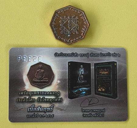 เหรียญสมนาคุณเนื้อสัมฤทธิ์ (เหรียญหล่อหลวงปู่ เดินหน อิเกสาโร รุ่นแรก เพชรยอดมงกุฎ (ระงับโศก รับโชคทุกทิศ) พร้อมบัตรรับรองหนังสือ หลวงปู่ เดินหน อิเกสาโร เล่ม 2 หมายเลข 35339