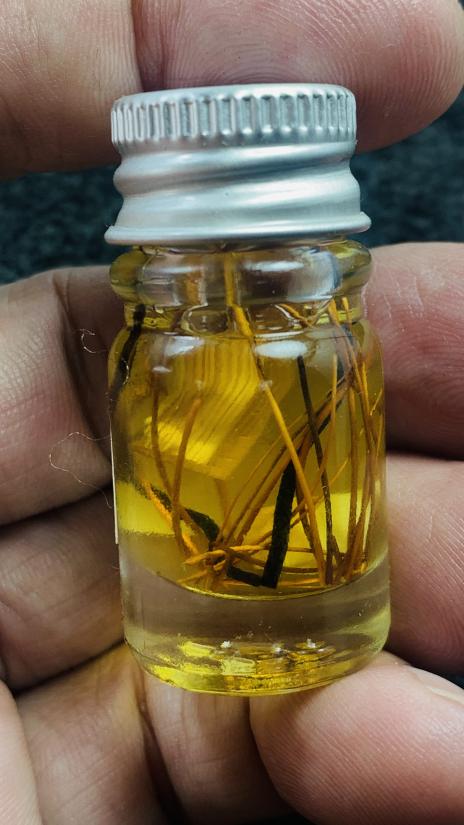 ในขวดนี้ มีนำ้มันที่พ่อท่านเขียวปลุกเสกตอนปี ๒๕๕๔ และน้ำมันบรมครูกาจับหลัก ของพ่อท่านแสง ปี ๒๕๕๘ ผสมอยู่ และนำไปปลุกกเสกในถ้ำ ที่วัดถ้ำยะลา และในอุโบสถ วัดห้วยเงาะ พ่อท่านเขียว ปลุกเสกเดียว