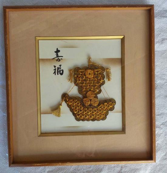 ***วัดใจ***เหรียญ 5 เยน ทำเป็นเครื่องรางนำโชค งานฝีมือแบบญี่ปุ่นดั้งเดิม โดยจัดเรียงเป็นรูปเรือใบ ประดับด้วยดิ้นสีทอง เพื่อความเป็นสิริมงคล |