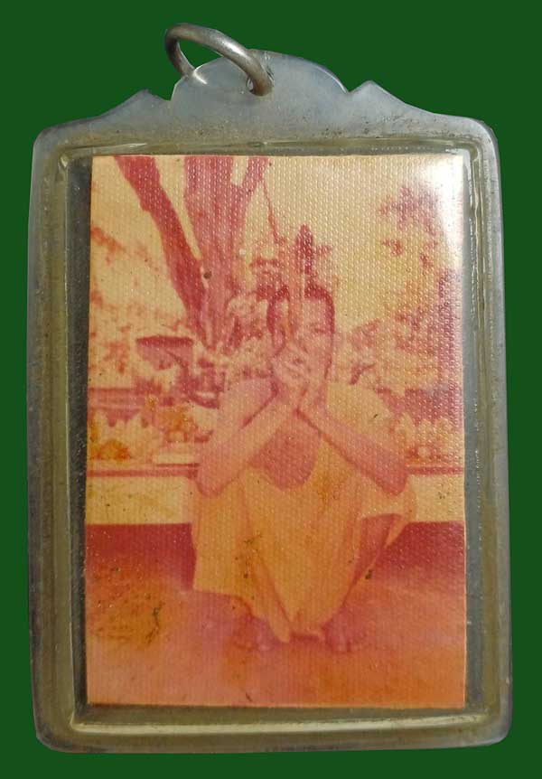 ชื่อพระเครื่อง รูปถ่ายกระดาษหนังไก่ ขนาด 2.5 x 3.5 ซ.ม. ด้านหลังบรรจุผง เกศา จีวร เลื่ยมเดิม เก่าไม่ทราบเกจิ
