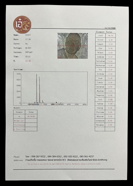 ใบตรวจสอบเปอร์เซ็นทอง 96.5 % เต็มตามที่ใบรับรองการผลิตแจ้งไว้