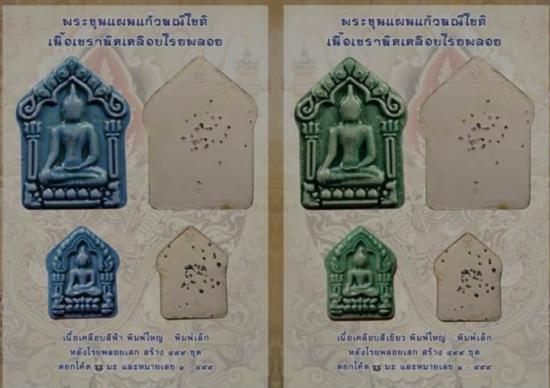 พระขุนแผนแก้วมณีโชติ(แก้วสารพัดนึก) เซรามิกเคลือบ โรยพลอย เนื้อเคลือบฟ้า วัดโพธิ์แก้วประสิทธิ์ จ. กระบี่ ปี ๒๕๕๘ เซรามิกเคลือบสร้าง ๓ สี ฟ้า เขียว และ เหลือง สร้างสีละ ๔๙๙ ชุดๆละ ๒ องค์ ผสมมวลสารพรายกัญญา พุทธศิลป์งดงามมาก พุทธคุณล้ำเลิศครับ |