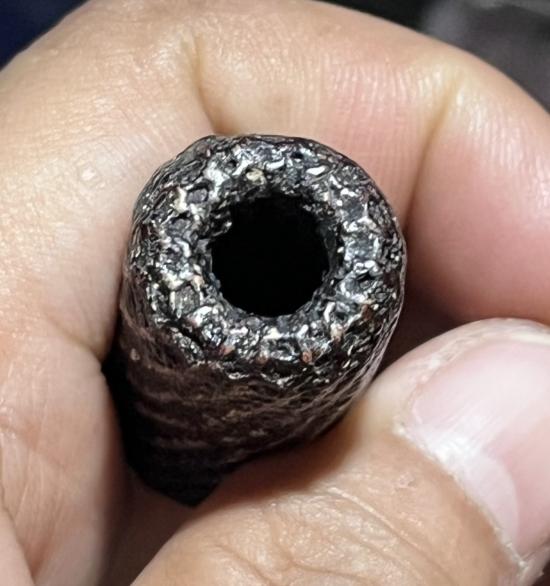ตะกรุดถักเชือกชุบรักยาว 1.5 นิ้ว โต 1.7 ซม ไม่ทราบที่นำ้หนักเบาไม่น่าเป็นเนื้อโลหะ |