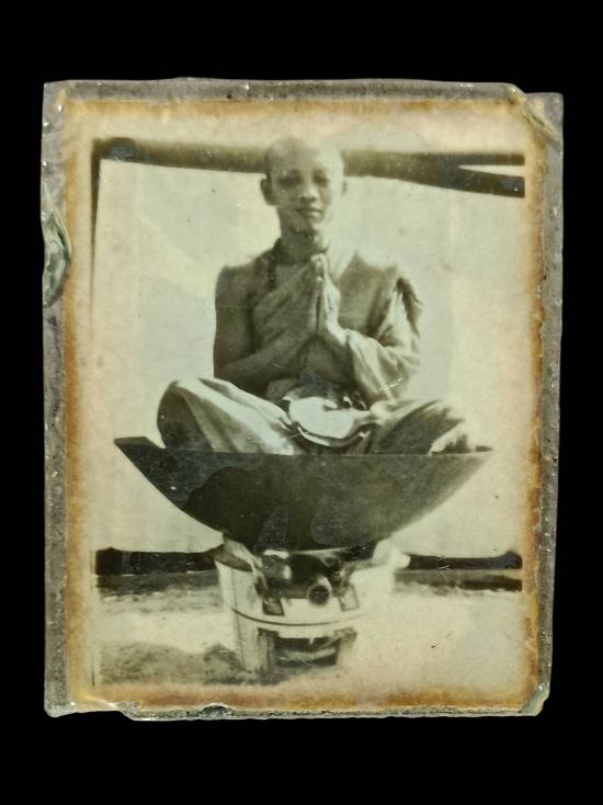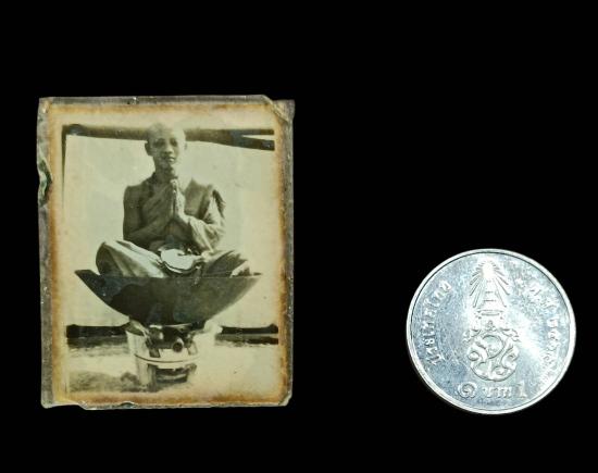 รูปถ่ายอัดกระจกพระเกจิ นั่งบนกระทะตั้งไฟ ไม่ทราบที่คับ |