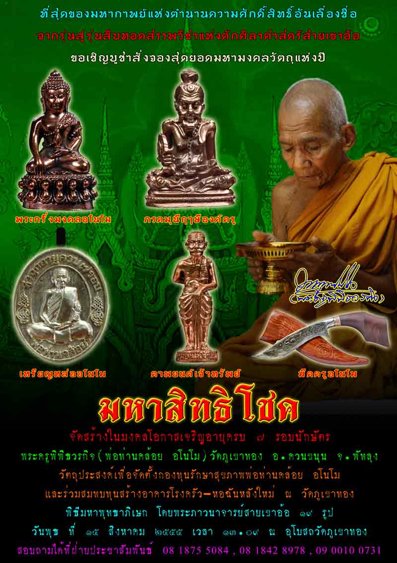 พิธีมหาพุทธาภิเษก โดยพระภาวนาจารย์สายเขาอ้อ 19 รูป วันพุธ ที่ 15 สิงหาคม 2555 เวลา 13.09 น. ณ อุโบสถวัดภูเขาทอง |