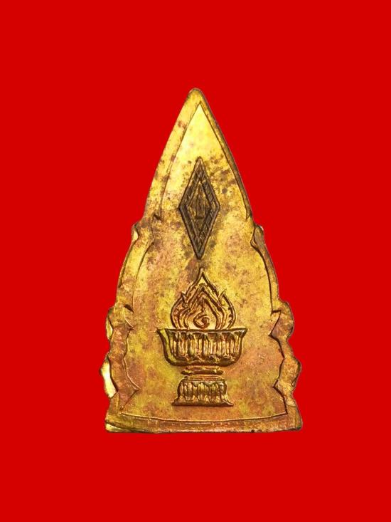 เหรียญพระพุทธชินราช หลัง พานพระศรี เนื้อกะไหล่ทอง ปี 2496 วัดพระศรีรัตน มหาธาตุ จ.พิษณุโลก ด้านหน้าเป็นรูป พระพุทธชินราชประทับนั่งบนฐานบัวบานสอง ชั้นอยู่ในซุ้มเรือนแก้ว ด้านหลังประทับยันต์ อกเลาและพาน |
