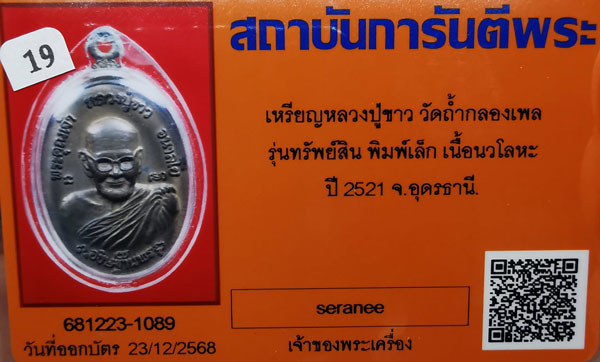 ชื่อพระเครื่อง เหรียญหลวงปู่ขาว วัดถ้ำกลองเพล รุ่นทรัพย์สิน พิมพ์เล็ก เนื้อนวโลหะ ปี2521 จ.อุดรธานี + บัตรG-pra สภาพสวยเดิมค่ะ