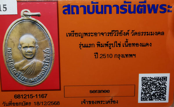 เหรียญพระอาจารย์วิริยังค์ วัดธรรมมงคล รุ่นแรก พิมพ์รูปไข่ เนื้อทองแดง ห่วงเดิม ปี2510 กรุงเทพฯ + บัตรG-pra สภาพเดิมค่ะ สภาพตามรูปทุกประการค่ะ
