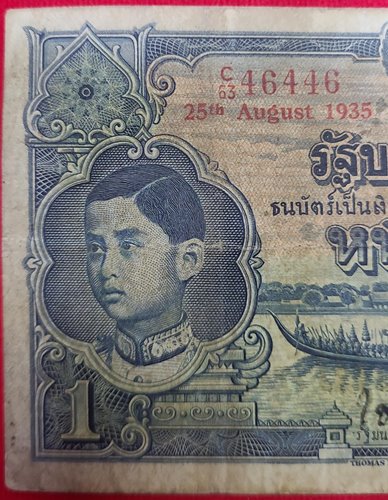 ธนบัตร 1บาท โทมัส รัชกาลที่ 8 หมายเลข 63C46446 - ๖๓ค ๔๖๔๔๖ ลายเซ็น พระยา ไชยยศสมบัติ พิมพ์เมื่อ วันที่ 25 สิงหาคม 2478 |