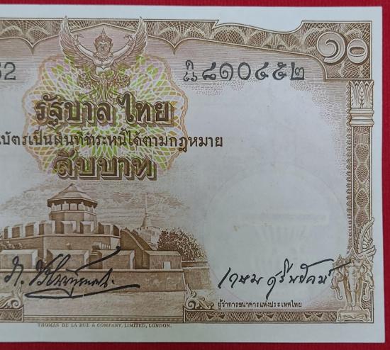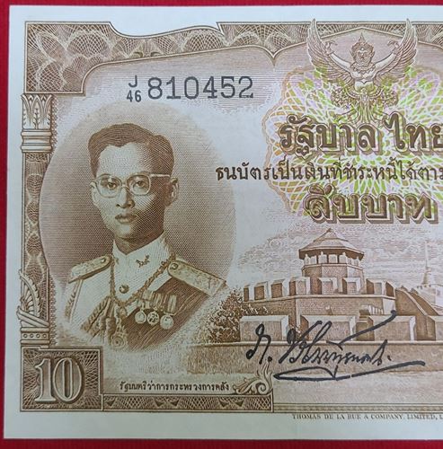 ธนบัตร 10 บาท โทมัส ในหลวงรัชกาลที่ 9 สภาพใหม่ ไม่ผ่านการใช้งาน ลายน้ำพานฯ หายาก หมายเลข 46J 810452-๔๖ด ๘๑๐๔๕๙ ลายเซ็น ภ.บริภัณฑ์ยุทธกิจ-เกษม ศรีพยัคฆ์ ขนาด 8.7 X 14.7 ซ.ม.ประกาศใช้เมื่อ วันที่ 25 พ.ย.2498 |