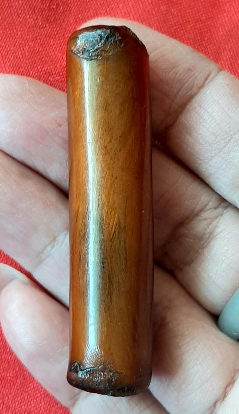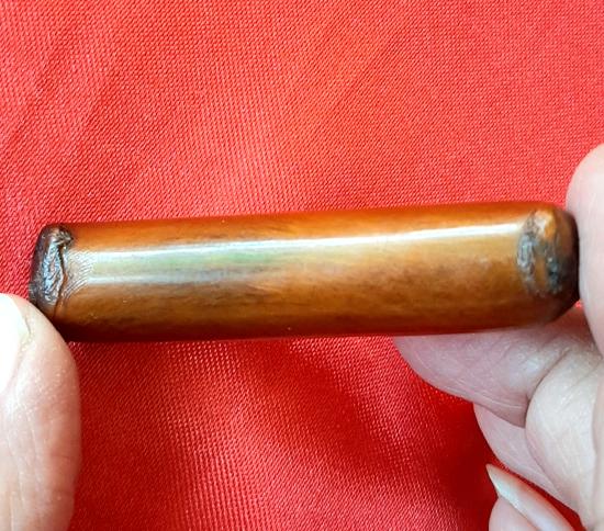 ตะกรุดหนังเสือ หุ้มด้วยพลาสติก เก่า ลนไฟ ปิดหัวปิดท้าย มีรู ไว้ร้อยเชือกแขวน |