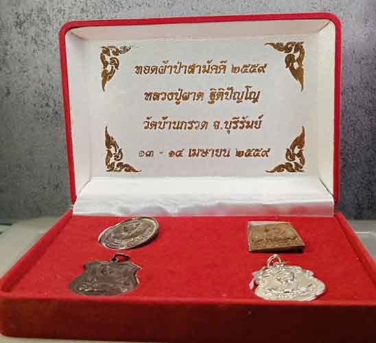 ชื่อพระเครื่อง ชุดเหรียญกรรมการ รุ่น ทอดผ้าป่า 59 เหรียญเก่าหลวงปู่ผาด ฐิติปัญโญปลุกเสก วัดบ้านกรวด บุรีรัมย์ ปี 2559 กล่องเดิม