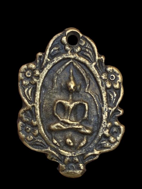 เหรียญหล่อเก่า เนื้อโลหะผสม พิมพ์ทรงลายดอกไม้ ล้อมกรอบองค์พระ