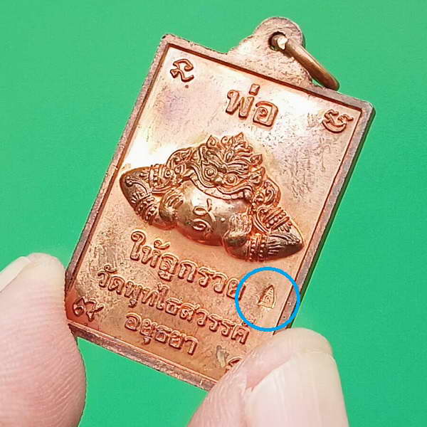 ตอกโค๊ด พระปรางค์ ด้านหลังเหรียญ ใต้แขนซ้ายราหู หลังคำว่า ให้ลูกรวย