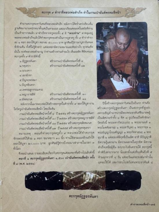 ตำนานตะกรุดมหาวิเศษดอกหนึ่งในจำนวน ๙ ดอกที่ หลวงพ่อสำเร็จ ได้ทำตะกรุดครูเนื้อ ทองคำแท้ อย่างละ 1 ดอกให้บูชาดอกละ 50,000 บาท ศิษย์หลวงพ่อรู้ข่าว มาจองบูชาจนหมด เพียงไม่กี่วัน ตะกรุดในตำนานมหาวิเศษดังกล่าว หลวงพ่อได้คล่ำเคร่งเรียนพื้นจิตมานานหนักหนาตั้งแต่เป็นเณร และมาเรียนต่อยอดเอาในสมัยที่ท่านได้เป็นเจ้าอาวาสแล้ว มาสำเร็จวิชานี้จากครูพระ ทั้งห้า มี พระท่าน มาคลุมอยู่ พอหลวงพ่อสำเร็จแล้วท่านได้ทำตะกรุดทองคำบูชาครู ทั้ง๙ ดอก ๙ วิชา และตะกรุดทั้ง ๙ วิชานี้ หลวงพ่อจะจัดสร้างในงานไหว้ครูเป่ายันต์พรหมสี่ ต่อจากนี้ไปอีก ๙ ปี โดยนับปีนี้เป็นปีแรก ตะกรุดทั้ง ๙ ตำรามีดังนี้