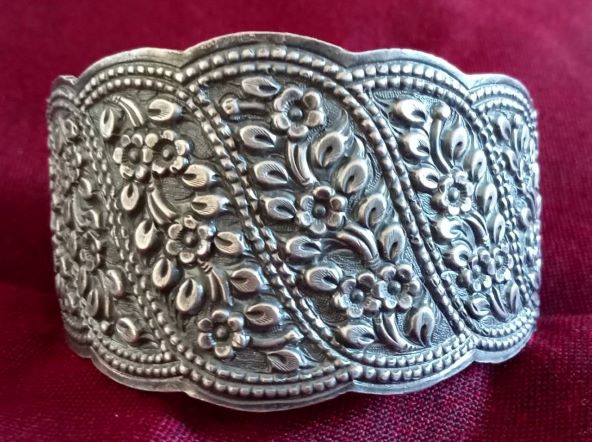 กำไลฝักมะขามเงินแท้แบบโบราณ ลายเถาเครือวัลย์ 10 แถว มีกาบเชิง 2 ด้าน ขนาดวงเกือบ 2.5 นิ้ว ปรับได้เล็กน้อย น.น.ประมาณ 3 บาท 2 สลึง 1 เฟื้อง วงนี้ตอกลายลึกชัดสวยมากใส่แล้วอลังการครับ งานหนามาก แข็งแรงทนทานและงดงามครับ มีตำหนิที่ปลายข้างหนึ่งนิดนะครับ สภาพตามรูป ส่งฟรีทั่วไทย รับประกันตามกฎครับ |