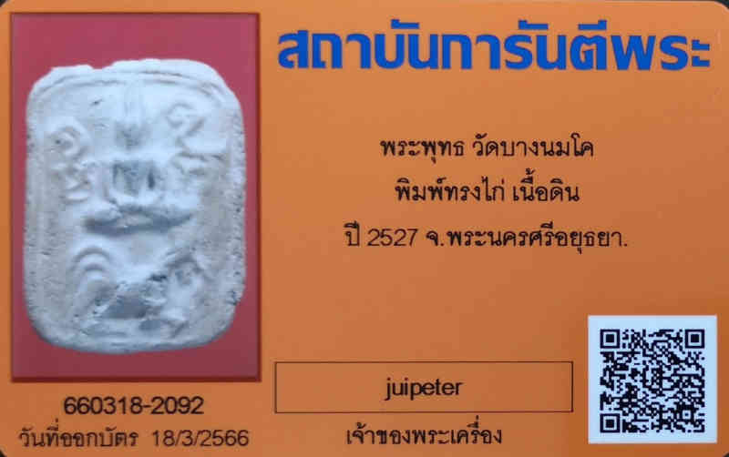 รายการนี้เป็นพระเนื้อดินเผาพิมพ์หลวงพ่อปานทรงไก่นิยมสุด วัดบางนมโค พระองค์นี้จัดสร้างในปี พ.ศ.2527 มีมวลสารเก่าของพระหลวงพ่อปานผสมอยู่เป็นจำนวนมาก ผงอุดเก่าตามสูตรโบราณ กำลังเป็นที่นิยม ใช้แทนพระหลวงพ่อปานยุคแรกองค์หลักแสน หลักล้านได้อย่างสบายใจ