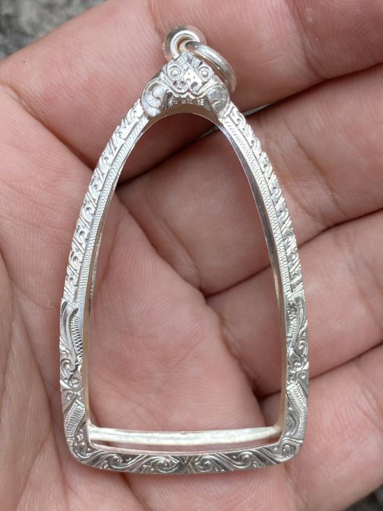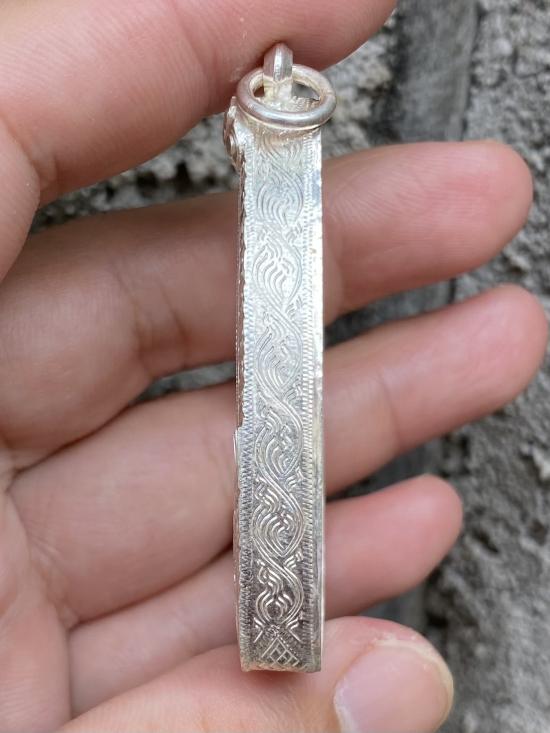 กรอบเงินแท้ สั่งทำมือ 2 เลี่ยมกันน้ำแล้วแกะออกไม่เคยผ่านการใช้ผ่านการคล้อง สภาพกรอบ 99% ไม่มีฉีดขาด |