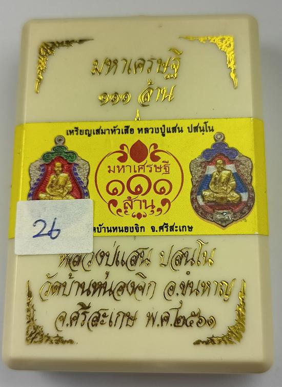ชื่อพระเครื่อง เหรียญเสมาหัวเสือ มหาเศรษฐี111ล้าน หลวงปู่แสน บ้านหนองจิก เนื้อเงินลงยาขอบ 2 สี เบอร์ 26 พร้อมกล่องเดิมครับ (เหรียญหนัก18.04กรัม)