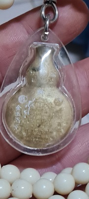 รายละเอียด เหรียญหล่อน้ำเต้าดูดทรัพย์เนื้อชนวน หลวงตาม้า วัดถ้ำเมืองนะ(พุทธพรหมปัญโญ) พร้อมรอยจารหลวงตาม้า เลี่ยมจากวัดพร้อมประคำ