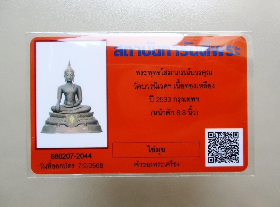 พระพุทธโสมาภรณ์บวรคุณ วัดบวรนิเวศวิหาร กรุงเทพฯ ในหลวงรัชกาลที่ 9 เสด็จพระดำเนินในพิธีเททอง พ.ศ.2533 หน้าตัก 9 นิ้ว เนื้อโลหะผิวแห้งหิ้ง พร้อมบัตรรับรองจากการันตีพระ !!