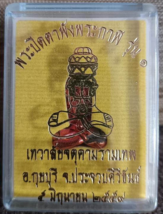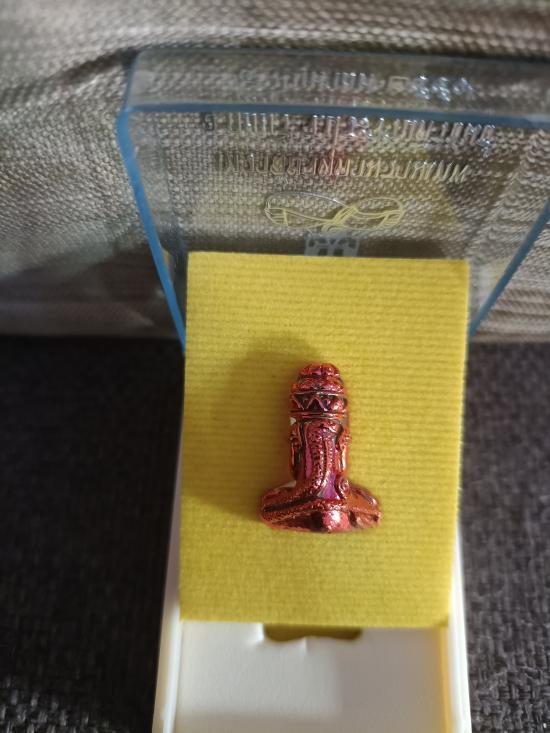 รูปหล่อลอยองค์ พระปิดตาพังพระกาฬ รุ่น1 สร้างเทวาลัยจตุคาม เนื้อทองแดง ผิวแดงๆ ก้นอุดผงปี ๓๐ พิมพ์เล็ก กว้าง ๑.๕ cm สูง ๒ cm พร้อมกล่องเดิมๆ