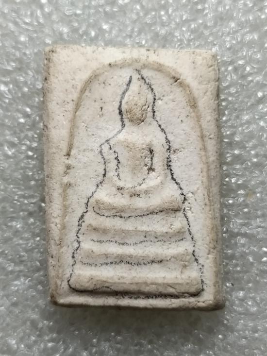 พระสมเด็จเนื้อผง มีจารดินสอรอบองค์พระ ไม่ทราบที่ครับ