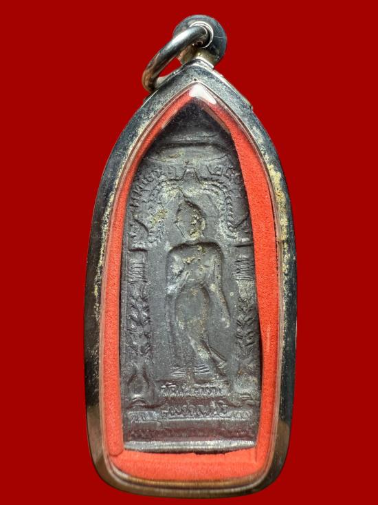 พระลีลากำแพงนิ้วซุ้มฉัตร เนื้อชิน หลวงพ่อขอม วัดไผ่โรงวัว ปี 2505 |