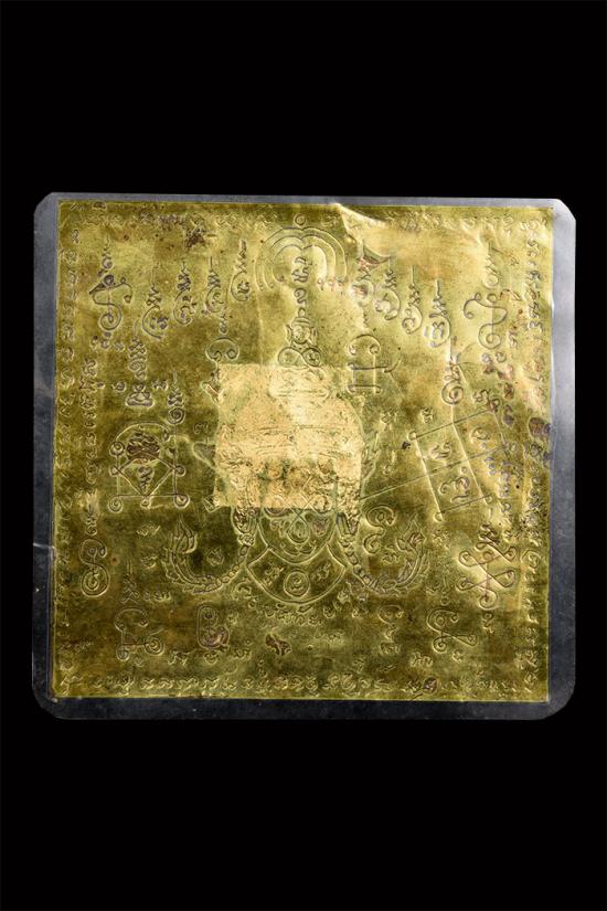 แผ่นทองเหลือง จารมือ ยันต์พระลักษณ์ หน้าทอง ขนาด 5 คูณ 5 นิ้ว ปิดทอง เคลือบพลาสติก มาแต่เดิม