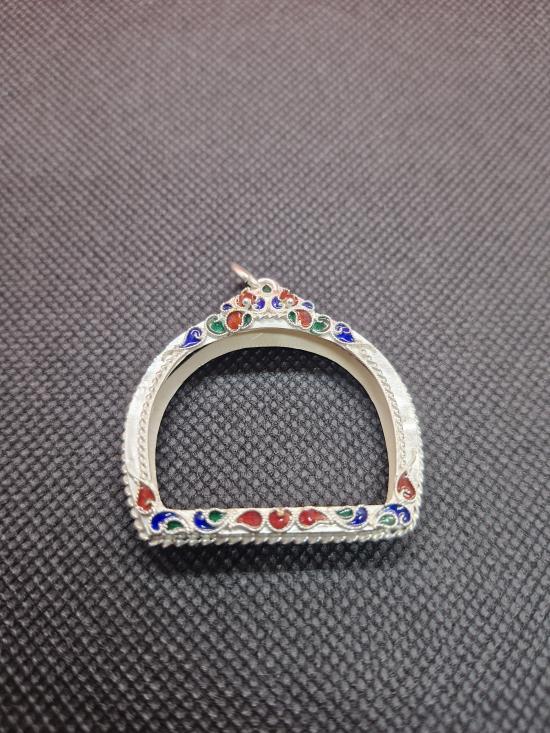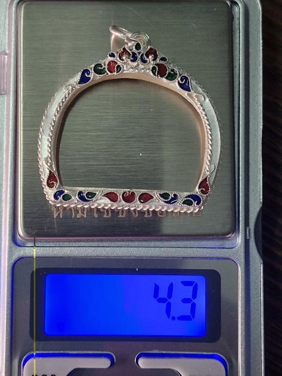 กรอบเงินลงยาสุโขทัย ขนาด กว้าง 3.3 ซ.ม. สูง 2.5 ซ.ม. น้ำหนัก 4.3 กรัม สำหรับใส่สิงห์ ลพ.เดิม/ ลพ.หอม/ ลพ.มุ่ย |