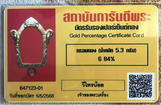 ทองคำ 84% กรอบทองคำ 3 ห่วง หนาๆสวยๆ น้ำหนัก 5.3 กรัม ขนาดกรอบตามภาพ กรอบในสูง 2.2 cm กว้าง 1.2-1.4 cm. |
