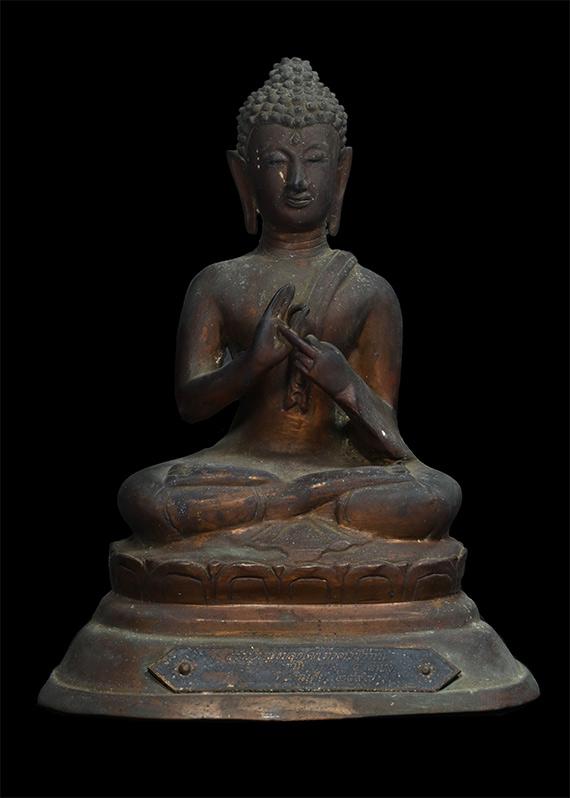 พระบูชาปางสนเข็ม วัดเวฬุราชิณฯ เนื้อทองเหลือง ปี 2497 (องค์นี้ เนื้อแดง แก่สำริด) นิยม หายาก! + บัตรรับรอง G-Pra
