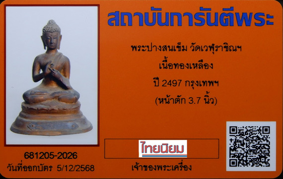 รายละเอียด พระบูชาปางสนเข็ม วัดเวฬุราชิณฯ เนื้อทองเหลือง ปี 2497 (เนื้อแดง แก่สำริด) นิยม หายาก! + บัตรรับรอง G-Pra