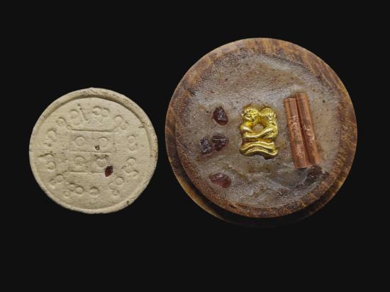 พญายูงคำ รุ่นแรก เนื้อเกสรทั้งห้า และ ตลับไม้สีผึ้งเนื้อหอม รังผึ้งร้าง ขวางเดือนขวางตะวัน รุ่นแรก ฝังอิ่น ตะกรุด ในเมตตาบารมี เจ้าปู่จั่นต่า กาวิสาละ พญานกยูง ขนาดเท่าเหรียญสิบบาท