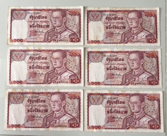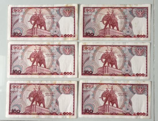 รายละเอียด ธนบัตร แบงค์ 100บาท รัชการที่9 หลังสมเด็จพระนเรศวรมหาราชทรงช้างศึก หลังช้างแดง จำนวน 6 ใบ (มีติดเหลือง)