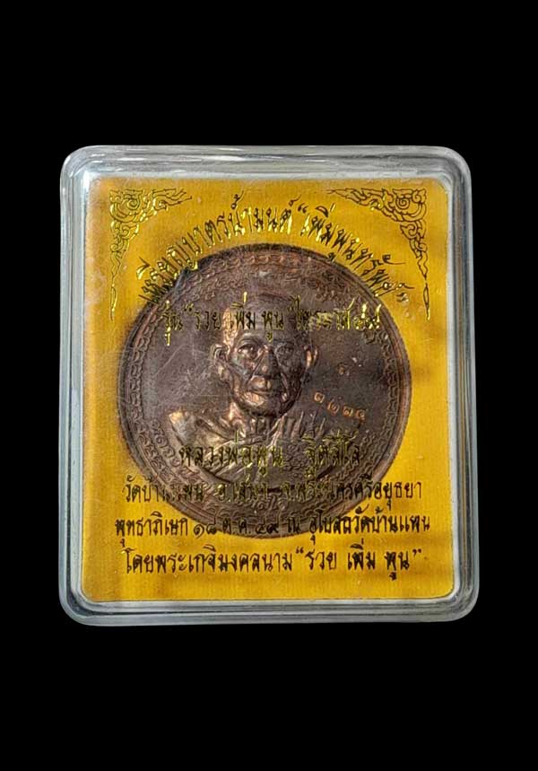 เหรียญบาตรน้ำมนต์รุ่นแรก "เพิ่ม พูน ทรัพย์" หลวงพ่อพูน วัดบ้านแพน อยุธยา ปี 49 เนื้อทองแดง หมายเลข 3234 ขนาด 4.3 ซม. |