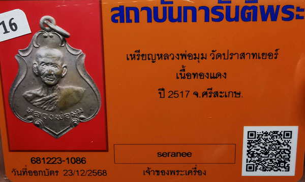 เหรียญหลวงพ่อมุม วัดปราสาทเยอร์ เนื้อทองแดงผิวไฟ ห่วงเดิม ปี2517 จ.ศรีสะเกษ + บัตรG-pra สภาพสวยเดิมค่ะ |