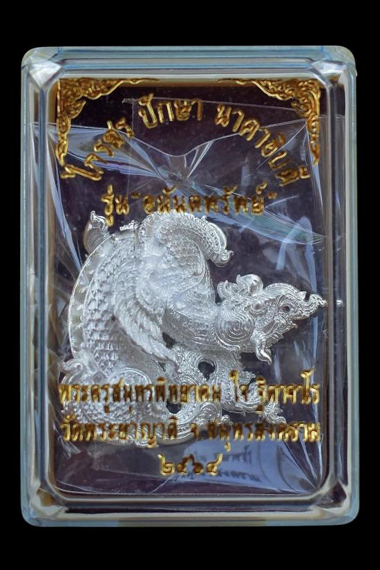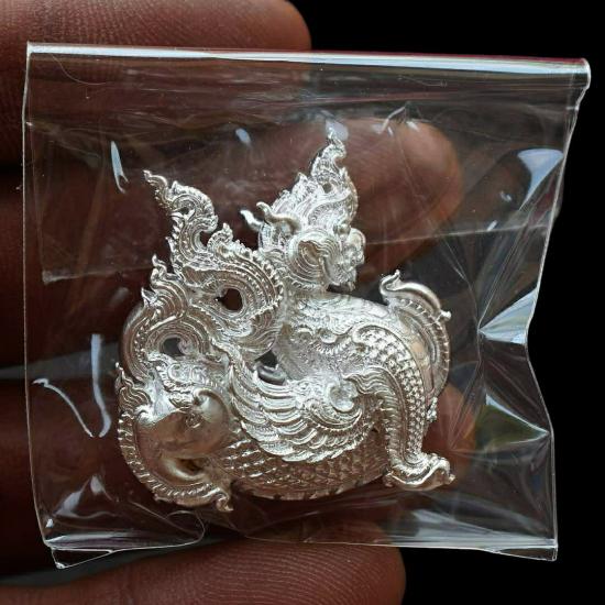 ไกรสร ปักษา นาคาธิบดี เนื้อชุบซาติน เงิน รุ่น อนันตทรัพย์ เบอร์ ๑๙ (แยกจากชุดกรรมการ สร้าง 111 ชุด) ปี 2564 หลวงพ่อใจ วัดพระยาญาติ จ.สมุทรสงคราม มีกล่อง + ซีนเดิมจากวัด สภาพพระตามรูปที่ลงทุกประการ (ขนาดยาว x สูงประมาณ 3.3 x 3.5 ซม.)