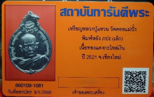 เหรียญ ภปร พิมพ์เล็ก หลวงปู่แหวน วัดดอยแม่ปั๋ง ปี2521 กะไหล่เงิน พร้อมบัตรจีพระ ครับ