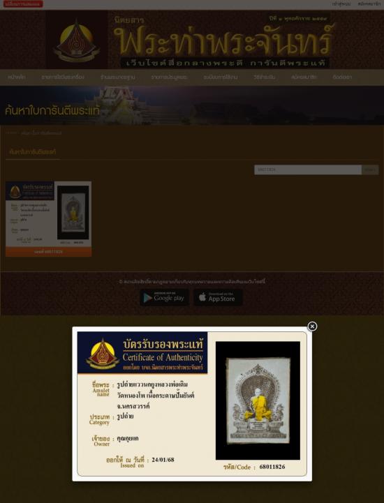 เคาะเดียวแดง รูปถ่ายแววนกยูง หลวงพ่อเดิม วัดหนองโพ เนื้อกระดาษปั๊มยันต์ มาพร้อมบัตรรับรองนิตยสารท่าพระจันทร์