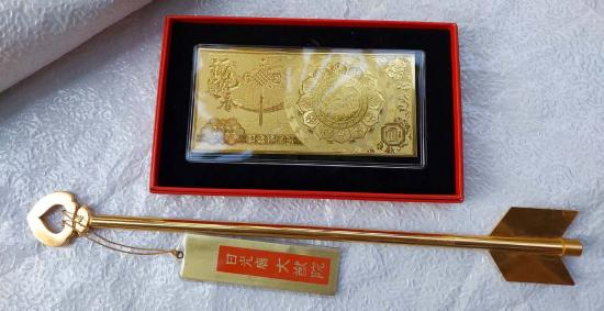 แผ่นการ์ดทอง ที่ระลึกปีเสือ 2022 กับ ลูกธนูศักดิ์สิทธิ์ของญี่ปุ่น ซึ่งเป็นเครื่องรางที่ใช้สำหรับปัดเป่าสิ่งชั่วร้ายและนำโชคดีมาให้ |