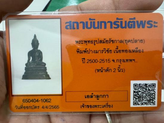 พระพุทธรูปสมัยรัชกาล ยุคปลาย พิมพ์ปางมารวิชัย เนื้อทองเหลือง ก้นดินไทย หน้าตัก 2 นิ้ว สูง 4.5 นึ้ว ฐาน 2.8 นึ้ว ปี 2500-2515 พร้อมบัตรรับรอง |