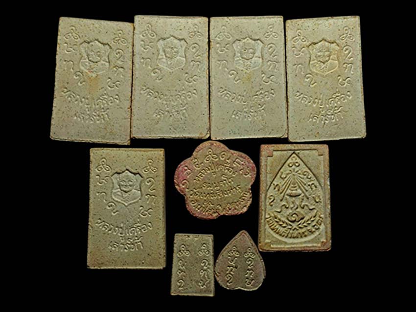 พระเครื่องชุด รวม 9 องค์ หลวงปู่เครื่อง ธมฺมจาโร ผงพุทธคุณทั้ง ๙ วัดเทพสิงหาร จ.อุดรธานีปี เสาร์ห้า พ.ศ.2519 กล่องเดิม(หูกล่องหัก)