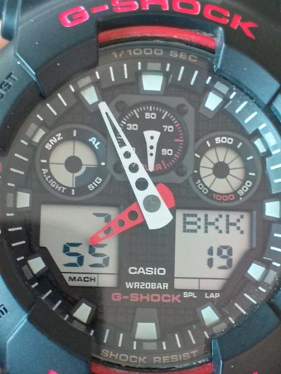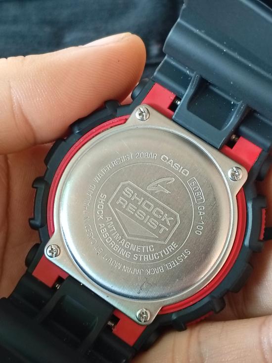 รายละเอียด @นาฬิกา Casio G-Shock รุ่น GA-100-1A4 เปลี่ยนสายมาใหม่ Casio G-Shock รุ่น GA-100-1A4 ตัวเรือนและสายเป็นสีดำด้านตัดกับรายละเอียดสีแดง มีหน้าปัดแบบผสมทั้งอะนาล็อกและดิจิทัล มาพร้อมฟังก์ชันจับเวลา 1/1000 วินาที, มาตรวัดความเร็ว, เวลาโลก, และกันน้ำลึก 20 บาร์
