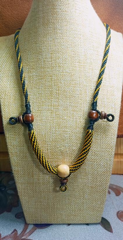 ชื่อพระเครื่อง สร้อยคอเชือกเทียน งานถักมือ ( สีดำ-เหลืองทอง + แซมลูกปัดไม้ธรรมชาติ ห้อยพระ 3 องค์ ) ยาว 22 นิ้ว ครับ