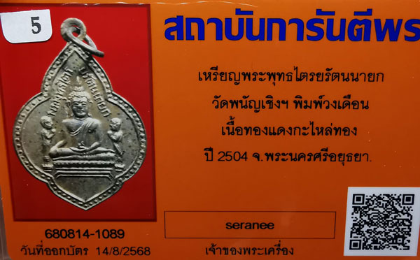 เหรียญพระพุทธไตรยรัตนนายก วัดพนัญเชิงฯ พิมพ์หลังวงเดือน เนื้อทองแดงกะไหล่ทอง ห่วงเดิม ปี2504 จ.พระนครศรีอยุธยา + บัตรG-pra สภาพสวยเดิมค่ะ |