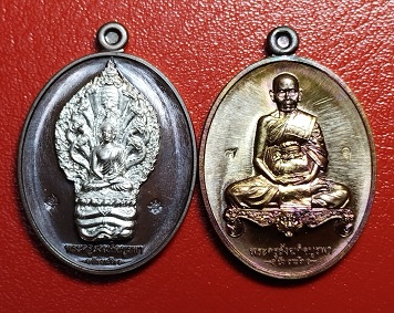 เหรียญหลวงปู่บัว รุ่นมงคลมหาลาภ เหรียญนั่่งโต๊ะเต็มองค์เนื้อทองแดง + เหรียญพระนากปรกเนื้อนวะหน้ากากเงิน รวม 2 เหรียญ ปี 2559 ราคาวัดใจ